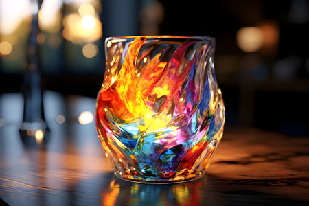 A close-up of a crystal glass reflecting vibrant and colorful lights, creating a visually striking and abstract artistic display with light and shadow.