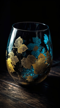 A detailed close-up of a wine glass showcasing an intricate abstract painting, set against a stylish backdrop. ideal for creative decor, this image highlights the fusion of art and fine dining aesthetics.