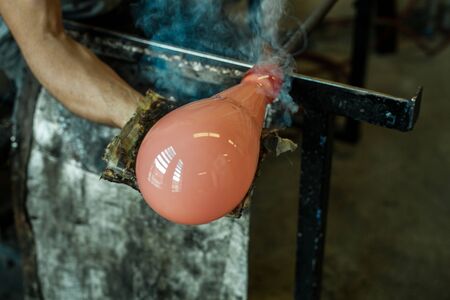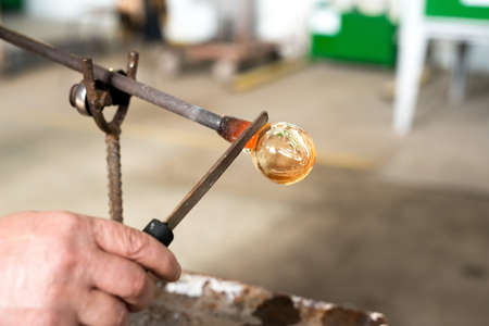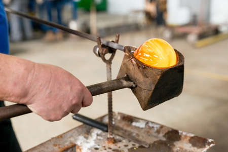 glass craftsman making a glass ball in a factory, blurred background