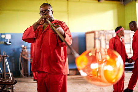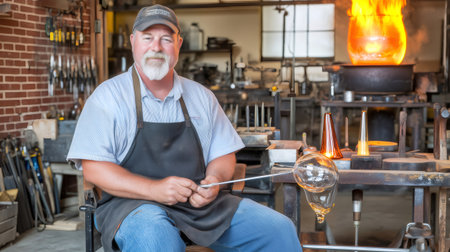 A glassblower crafting a beautiful glass vase in a hot shop, demonstrating artisan expertise