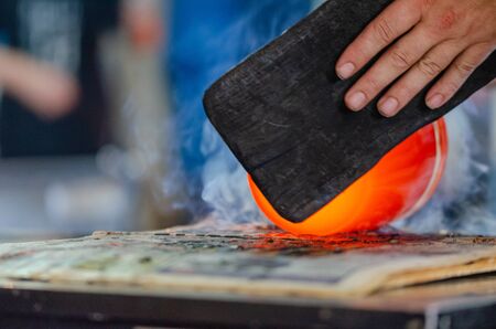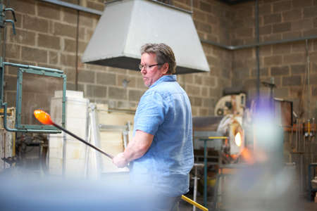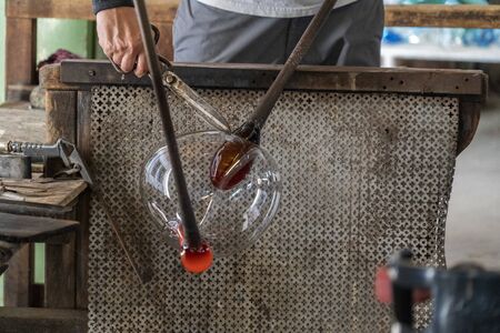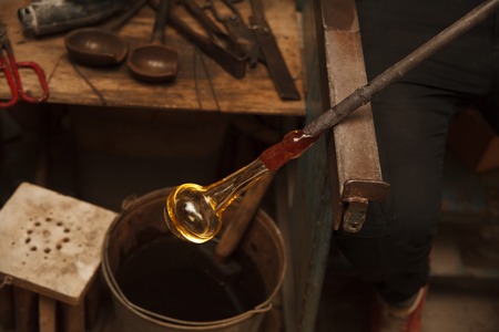Glass blower manufacturing process, moment of shaping the glass at a glass makers workshop