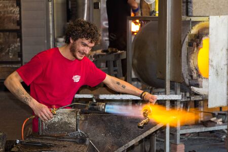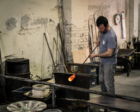 Murano island, Italy - April 23, 2017: Glassblowing artisan at work in a crystal glass workshop in Murano island, Venice. Murano glassmakers use the same tools as their ancestors have thousands of years ago.