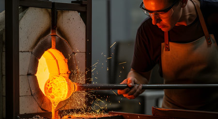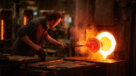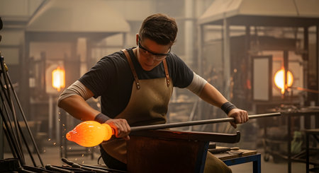 Artistry in motion: skilled glassblower shaping molten glass in workshop setting.