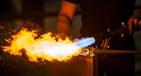An artist or craftsperson is using a blowtorch to heat and shape a piece of molten glass. The intense orange and blue flames create a dramatic scene of skilled craftsmanship in a workshop.