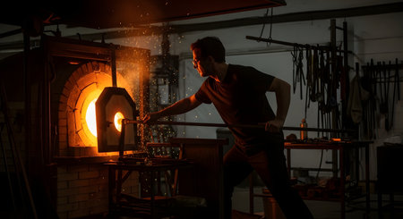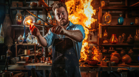 Glassblower holding a metal blowpipe with molten glass in a workshop with a furnace burning in the background