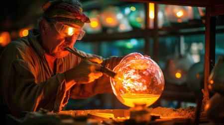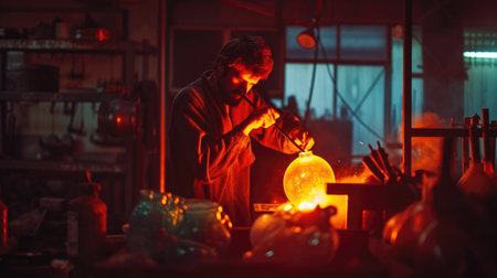 A skilled artisan carefully shapes glowing glass in a workshop illuminated by warm artificial light.