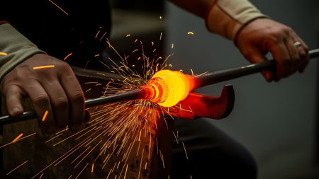 Skilled hands shaping molten glass with intense sparks flying in a dark workshop