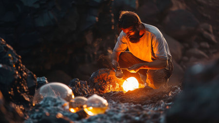 A dedicated artisan engages in the intricate process of glassblowing, surrounded by molten glass and dynamic heat in a vibrant studio environment.