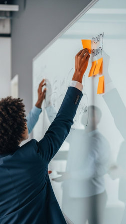 Business colleagues collaborating, using sticky notes on glass board, brainstorming innovative project strategy with focused teamwork and dynamic communication. Business people concept
