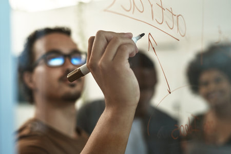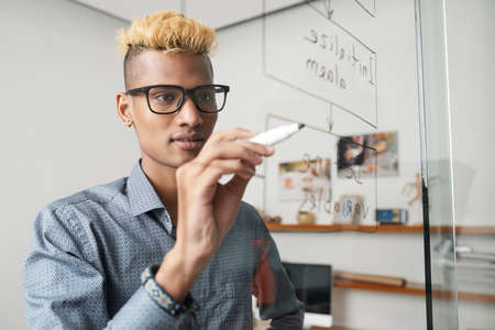 African American young man writing note on a transparent wipe board and thinking of a solution for him work-related problems, Colleagues Having A Business Meeting