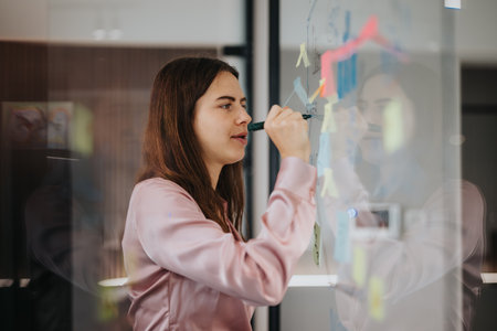 Young businesswoman brainstorming with sticky notes on a glass wall in a modern office