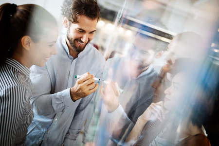 Business colleagues planning strategy, writing notes on glass wall, collaborating with enthusiasm in bright contemporary workspace