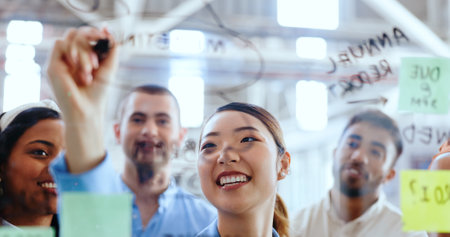 Asian woman, leader and writing on glass wall, sticky note and business people collabpration for creativity or design training. Teamwork, post it and leadership, coaching or planning goals strategy