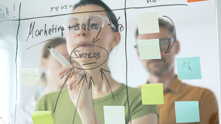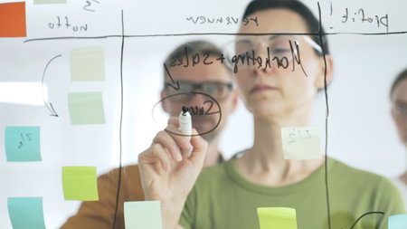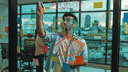 Business people team brainstorming strategic goals, mapping innovative concepts on transparent whiteboard with colorful sticky notes and black marker in modern office