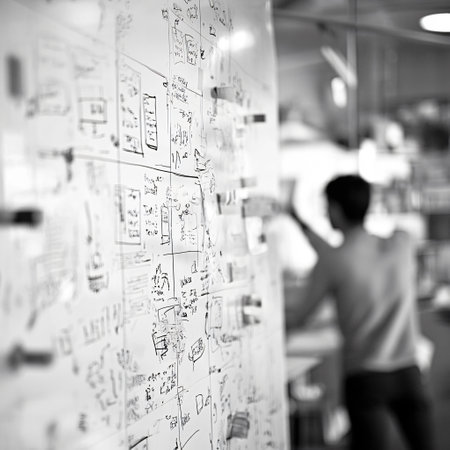Monochrome Startup Office Scene with Whiteboard Covered in Handwritten Notes and Sketches for Productivity Brainstorming