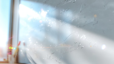 A visually captivating glass surface features scribed notes and reflections, beautifully illuminated by incoming sunlight. This image captures creativity in a modern workspace.