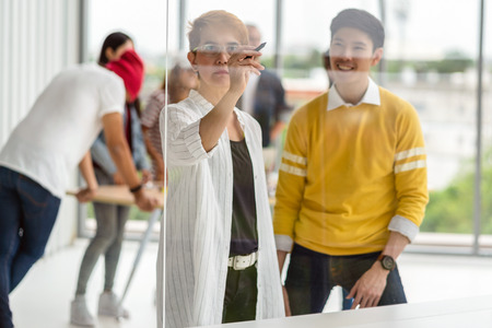 Senior Asian creative woman hand writing on the millor board over Group Of Asian Business people with casual suit in the modern workplace