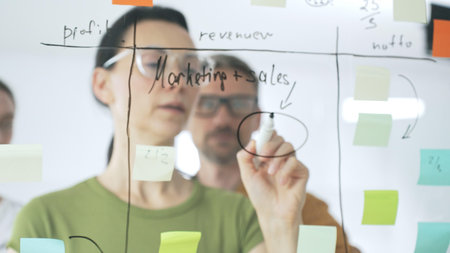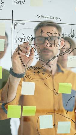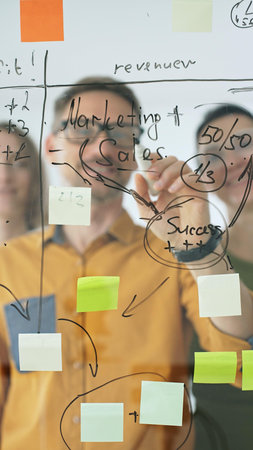 Professional team brainstorming strategic goals, mapping innovative concepts on transparent whiteboard with colorful sticky notes and black marker in modern workspace