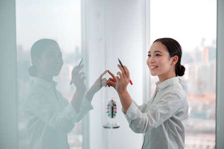 Businesswoman uses a pen in her hand to write a note on a notepad on white board to remind and brainstorm business ideas.