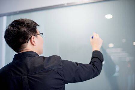 Young Asian businessman writing on empty whiteboard in meeting room or conference room. Business presentation concept