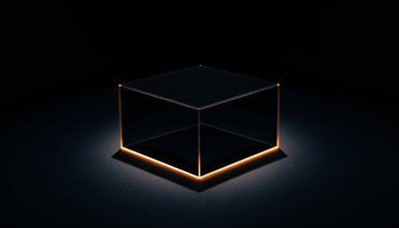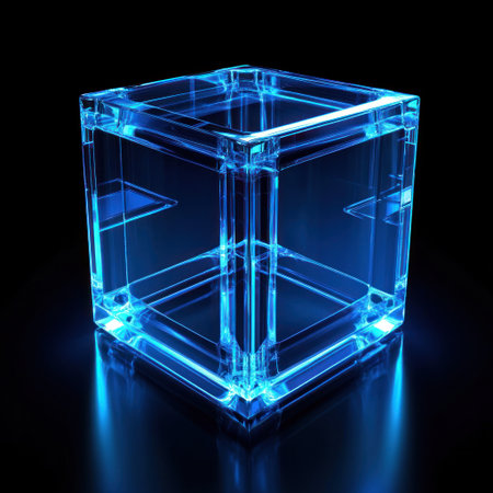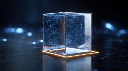 A clear cube illuminated by glowing edges stands out against a dark abstract background, showcasing modern design and technology concepts.