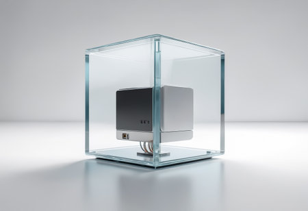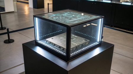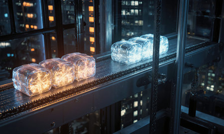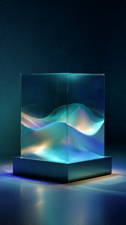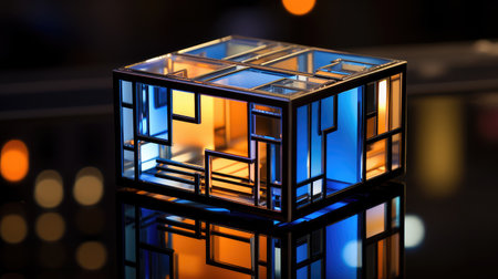 Stunning crystalline cube glowing with light in modern architecture, an abstract design element perfect for technology, science, and future concepts