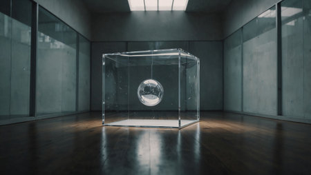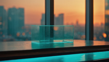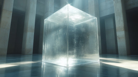 A transparent cube illuminated by sunlight in a minimalist architectural space during the late afternoon. Generative AI