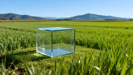 Empty glass cube on green grass field with mountains in the background.