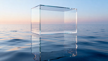 A glass cube floating on top of a body of water. AI.