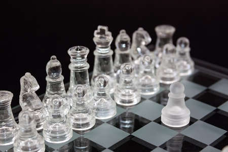 chess of glass on a black background, the first move of the game. Minimal business concept.