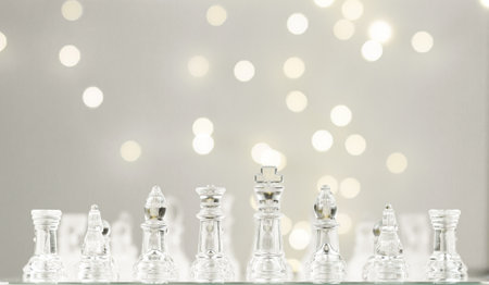 Glass chess on a light background with blurred lights and highlights. Postcard with chess pieces standing in a row, space for copy. Conceptual photograph with chess pieces. Board game