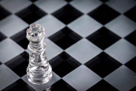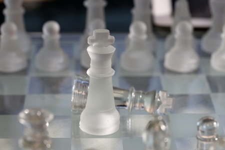 Chess with game pieces made of glass, queen, king, pawn and game board made of glass in black and white