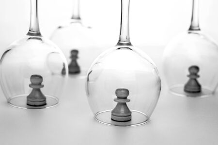 Self-isolation and social distancing concept metaphor. White pawn under glass dome on white background. Melancholy atmosphere.