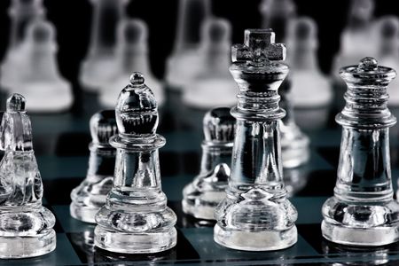 Glass chess pieces on a glass chessboard with reflection, on a black background.
