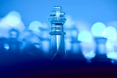 glass chess board game in black background ,selective focus on King, leadership ,winner concept