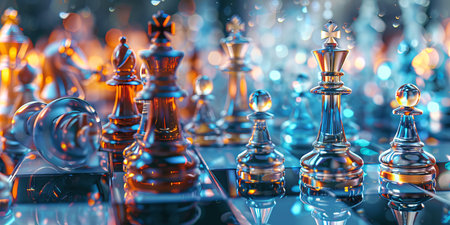 Glass chess pieces on a chessboard with colorful lighting. Concepts of strategy, board games, intelligence, competition.. Abstract background.