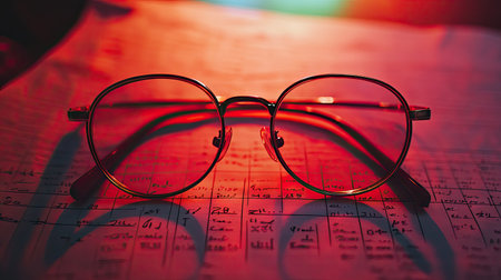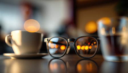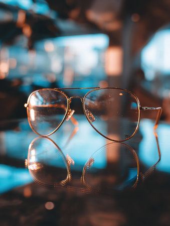 Close-up of stylish eyeglasses on a desk, with warm bokeh lights in the background, representing focus, vision, and professional ambiance.