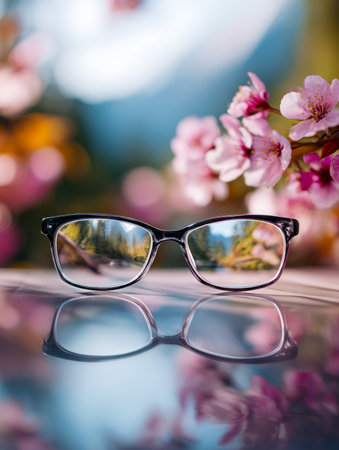 Elegant black-rimmed glasses sit on a mirror-like surface, revealing a vivid forest landscape through their clear lenses, framed by delicate pink blossoms in gentle blur.