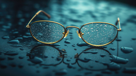 Wet eyeglass lenses with water droplets, laid on a smooth reflective surface, creating soft reflections and shadows.