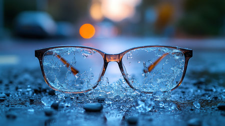 Broken glasses rest on a rainy surface, capturing blurred city lights in the background