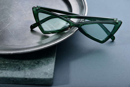 Pixel sunglasses design with green lenses shoot in a summer day closeup. Selective focus