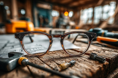 A pair of eyeglasses with a brown wooden frame rests on a rough wooden surface. Various tools like a hammer, screwdriver, and wrench are scattered around. A blueprint is partially visible beneath the glasses. The background is blurred, showing a workshop setting with other tools and equipment. The lighting creates a warm, inviting atmosphere.