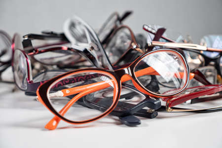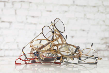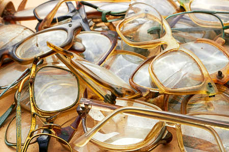 Heap of scratched and broken eyeglasses on black wooden boards. Repairing and replacing old eyeglasses, eye care