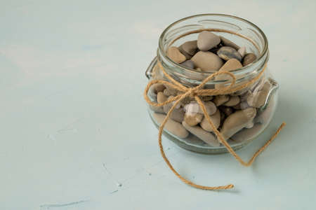 A transparent glass jar sits on a flat surface against a soft blue backdrop illuminated by gentle sunlight creating a serene ambiance.