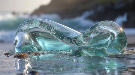 showing abstract curved glass tubes forming a wave-like structure with subtle bubbles and reflections on a...