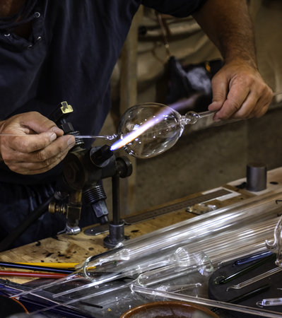 Detail of a glass craftsman, shaping glass with fire