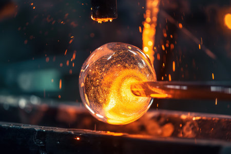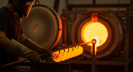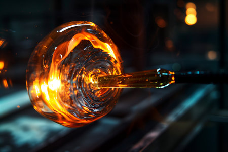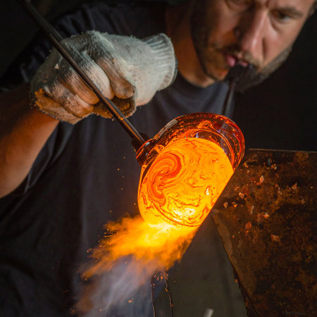 Molten glass being shaped by artisan symbolizing traditional craftsmanship and heat-intensive glassblowing process.