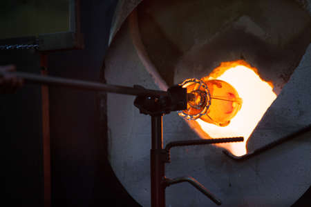 Close up of a glassblower artisan shaping the hot molten glass at strong fire inside a workshop. Manual glass processing by the craftsmen inside a glass factory