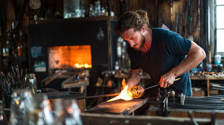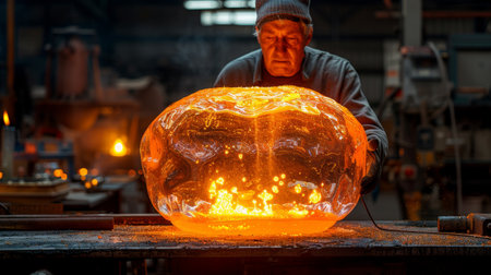 In the intense heat of the workshop, a master glassblower concentrates, skillfully shaping a glowing orb of molten glass.