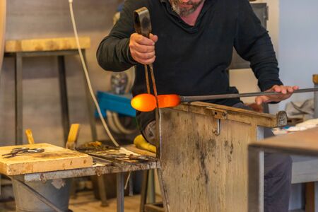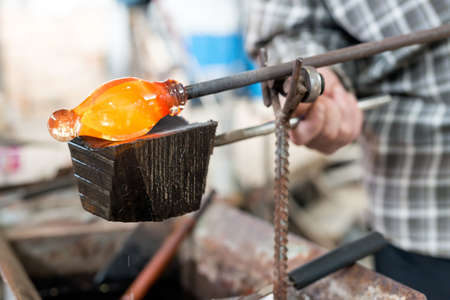 Glass blower shaping a bubble of melted glass on a rod by hand in the manufacturing process at a glass maker's workshop, shallow depth of field